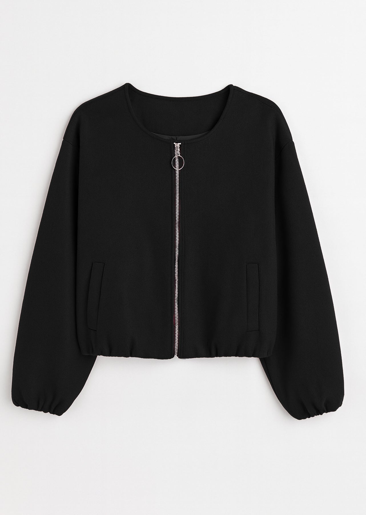 Elevate your outerwear with this modern collarless bomber jacket, crafted from soft, structured wool felt. Featuring a unique balloon silhouette, clean lines, and a sleek zip-front closure, it's the perfect blend of minimalism and statement style. A versatile layering piece for cooler days