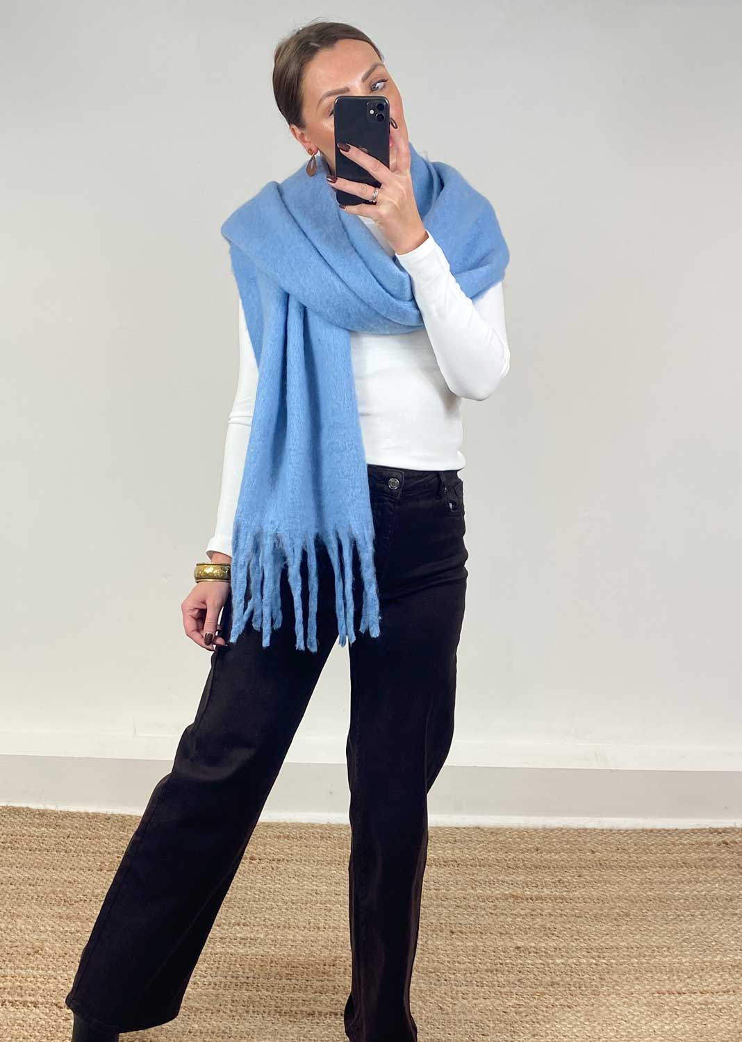 Wrap yourself in warmth and style with the Alba fluffy blue blanket scarf. Soft and cosy, it features a bold crimson colour and chunky tassels at the ends, adding a fun, textured detail. Perfect for chilly days, this oversized scarf is both a fashionable and functional accessory