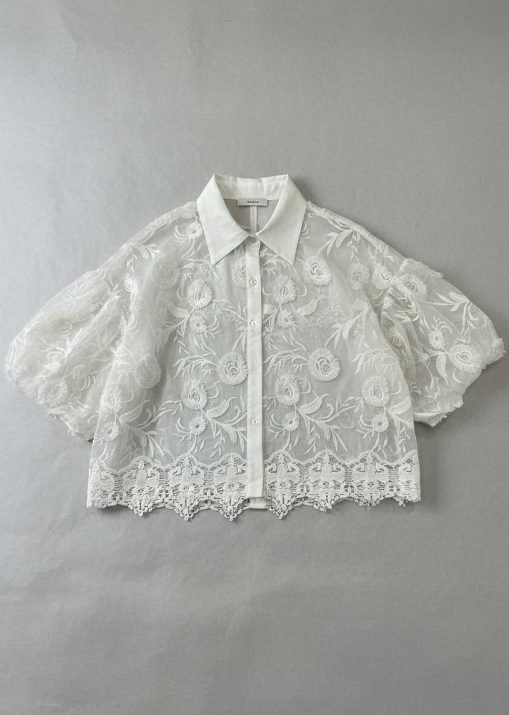 A refined take on everyday elegance, this Parisian appliqué short blouse is crafted from lightweight cotton and detailed with delicate tonal embroidery throughout. The intricate appliqué floral pattern adds subtle texture, while the crisp collared neckline and button-through front keep the look timeless and polished.